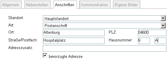 Der Hauptstandort sollte sowohl bei der Adresse als auch bei den zugehörigen Kommunikationsdaten durch das Merkmal "bevorzugt" gekennzeichnet werden. Zwei Adressen können nicht gleichzeitig das Merkmal "bevorzugt" beinhalten.