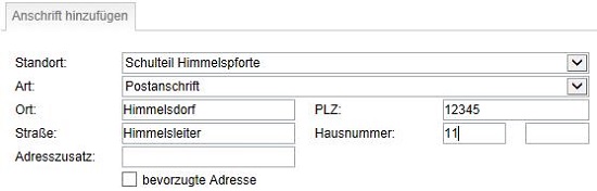 Es können mehrere Anschriften für den Hauptstandort bzw. die Schulteilstandorte erfasst werden, wobei jeweils eine als bevorzugt gekennzeichnet werden muss. Schulteil, Art, Ort, PLZ und Straße sind Pflichtfelder, wobei der Schulteil und die Anschriftart aus einem Drop-Down-Menü gewählt werden können.
