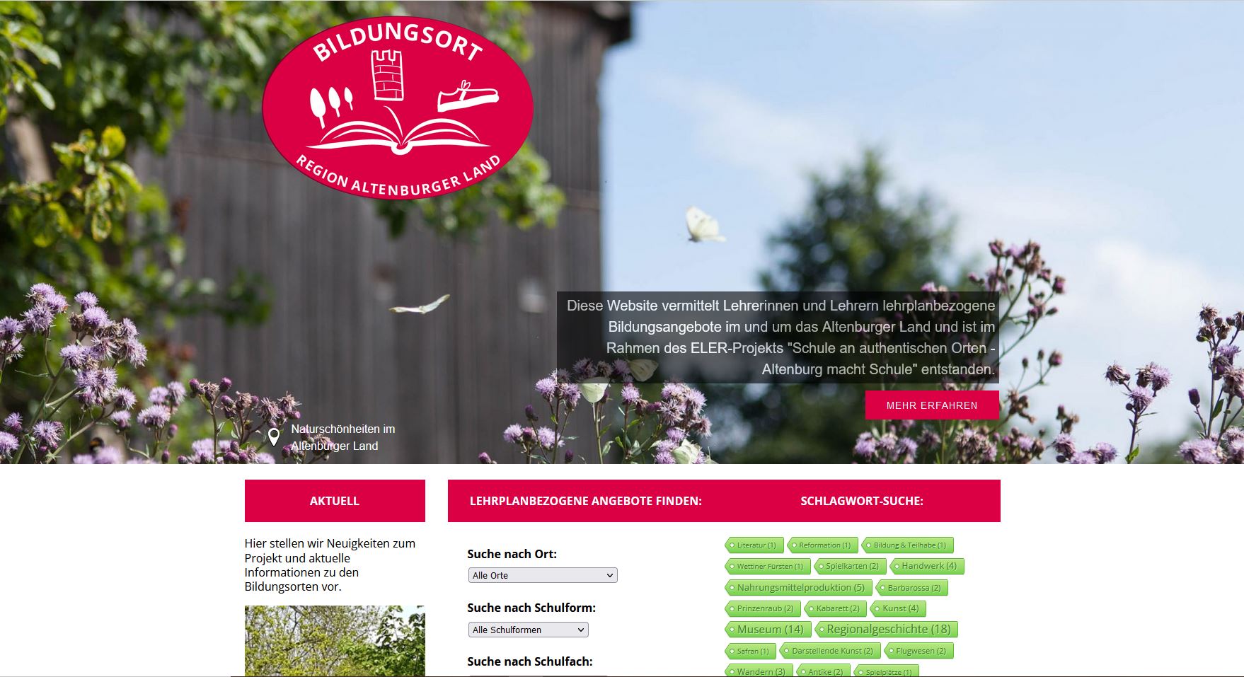 Seit 2022 können Lehrerinnen und Lehrer im Altenburger Land und im Dreiländereck auf der Plattform www.bildungsort-altenburgerland.de kostenfrei Inspirationen für Schulausflüge in der Region finden. Denn auf der Website sind vielfältige lehrplanbezogene Angebote und Ausflugsmöglichkeiten im und um das Altenburger Land gebündelt und werden auf der Startseite über eine Filter- oder Schlagwortsuche angezeigt. Gefiltert werden kann nach Ort, Schulform, Schulfach, Thema oder per Freitextsuche. Alternativ können Website-Besucher auch in den präsentierten Ausflugsideen ungefiltert stöbern.