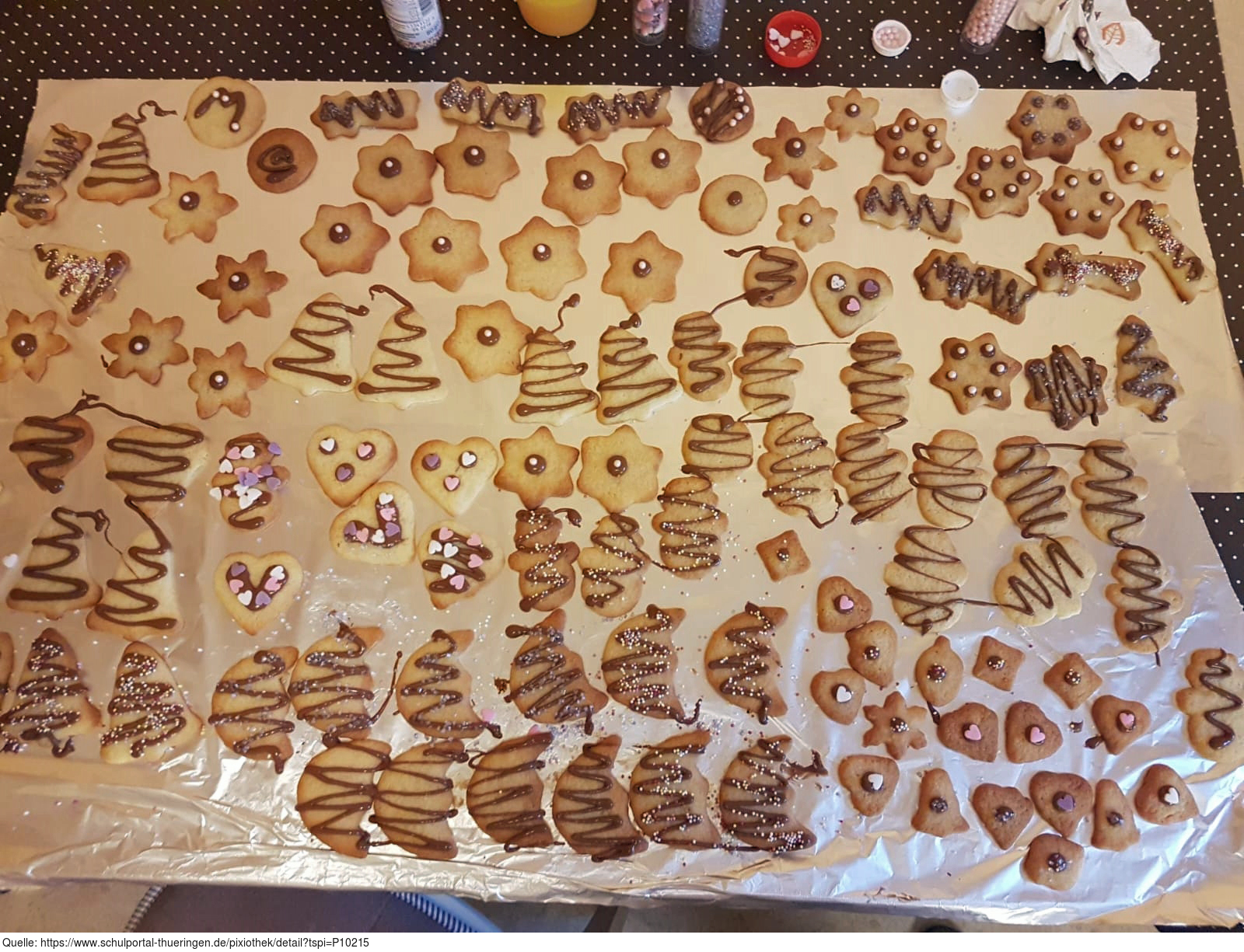 Das Foto zeigt Weihnachtsplätzchen, die nach dem Backen mit Schokoladenguss und Zuckerstreuseln dekoriert wurden. Es gelten die Nutzungsbedingungen der Mediothek und Pixiothek.