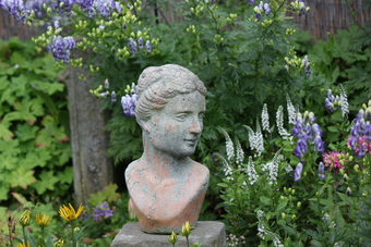 Das Foto zeigt eine Statue/ eine Büste im Garten/im Park. Das Bild ist unter CC0 lizenziert und kann somit frei verwendet werden.