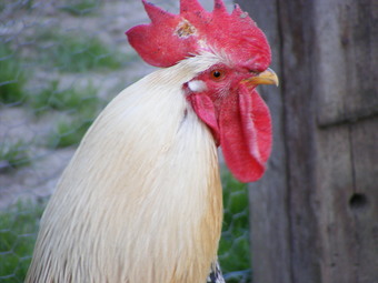Das Foto gehört zur Serie "Bauernhof". Es zeigt einen weißen Hahn mit rotem Kamm. Das Haushuhn (Gallus gallus domesticus) gehört zur Familie der Fasanenartigen (Phasianidae). Das Bild ist unter CC0 lizenziert und kann somit frei verwendet werden.