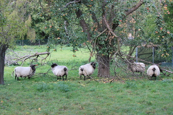Hausschafe unter einem Apfelbaum