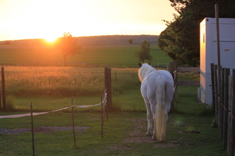 Das Foto gehört zur Serie "Pferde". Es zeigt einen Schimmel, der in Richtung Sonnenuntergang sieht. Das Bild ist unter CC0 lizenziert und kann somit frei verwendet werden.