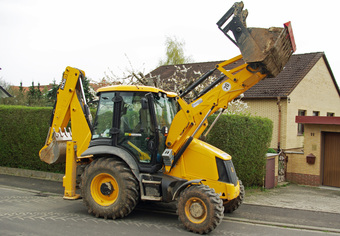 Das Bild zeigt einen Baggerlader, auch Heckbagger genannt, mit Ladeschaufel vorn und Tieflöffel hinten. Das Bild ist unter CC0 lizenziert und kann somit frei verwendet werden.