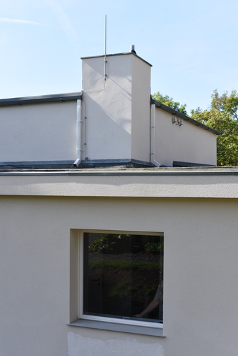 Das Foto gehört zur Serie "Bauhaus in Weimar". Das Musterhaus „Am Horn“ ist ein in Weimar errichtetes Versuchshaus des Staatlichen Bauhauses. Es war ein zentrales Element der ersten Bauhaus-Ausstellung vom 15. August bis 30. September 1923. Für das Bauhaus-Versuchshaus wurde der Entwurf von Georg Muche realisiert. Die praktische Umsetzung des Entwurfs Muches besorgten Walter March und Adolf Meyer vom Gropius’ Architekturbüro. Die Ausstattung basierte auf einem Gemeinschaftswerk aller Werkstätten des Bauhauses.