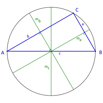 Das Bild gehört zur Serie "Mathematik Geometrie". Es zeigt die drei Mittelsenkrechten in einem rechtwinkligen Dreieck. Die Mittelsenkrechten schneiden sich in einem Punkt. Das ist der Mittelpunkt vom Umkreis des Dreiecks. Das Bild ist unter CC0 lizenziert und kann somit frei verwendet werden.