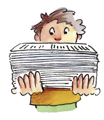 Das Bild gehört zur Serie "Unterricht". Es zeigt einen gezeichneten Jungen mit einem Stapel Material für den Unterricht. Es gelten die Nutzungsbedingungen der Mediothek und Pixiothek.