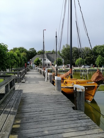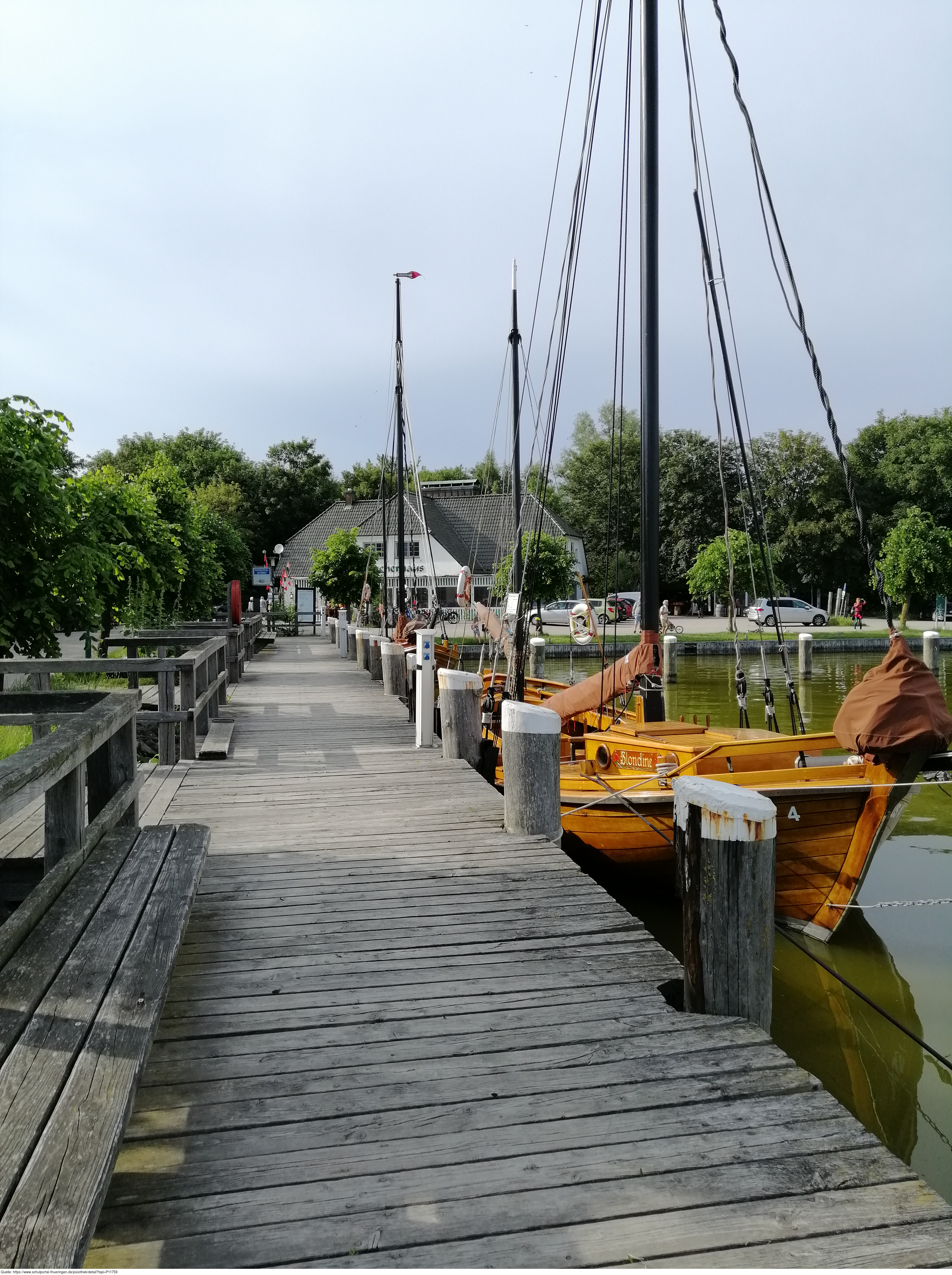 Das Foto zeigt ein Zeesenboot im Hafen von Ahrenshoop. Ein Zeesenboot (auch Zeesboot oder Zeeskahn) ist eine breitrumpfige Bootsart für flache Gewässer wie Haff oder Bodden. Der Name leitet sich vom Fischfanggeschirr, der Zeese, ab. Der Hafen im Ahrenshooper Ortsteil Althagen befindet sich am Nordwestufer des Saaler Boddens. Das Bild ist unter CC0 lizenziert und kann somit frei verwendet werden.