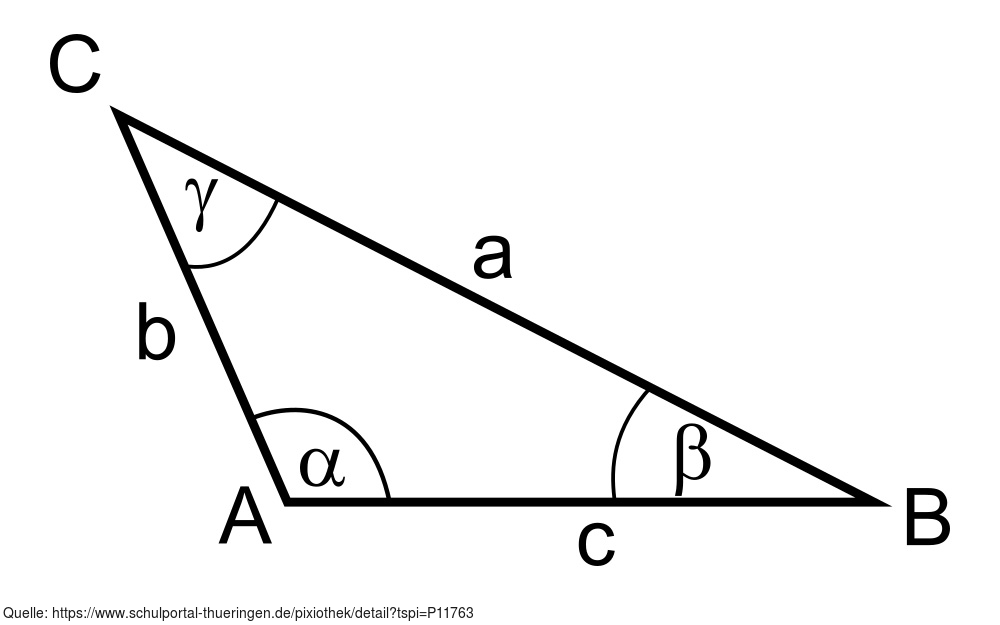 Das Bild gehört zur Serie "Mathematik Geometrie". Es zeigt ein stumpfwinkliges Dreieck mit Bezeichnung der Eckpunkte, Seiten und Innenwinkel. Das Bild ist unter CC0 lizenziert und kann somit frei verwendet werden.