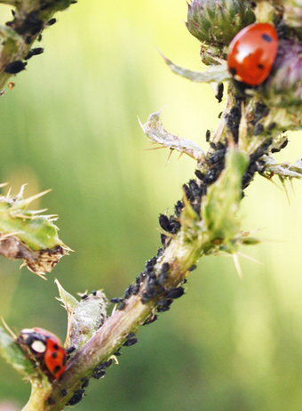 Das Foto hehört zur Serie "Käfer". Es zeigt Marienkäfer und Blattläuse auf einer Ackerkratzdistel. Es gelten die Nutzungsbedingungen der Mediothek und Pixiothek.