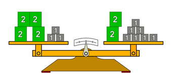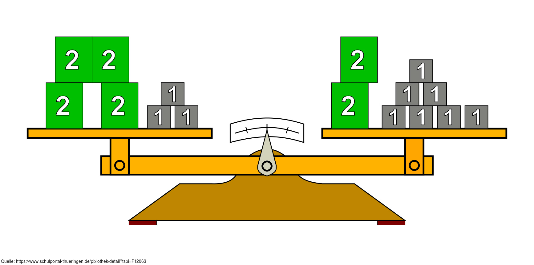 Das Bild gehört zur Serie "Mathematik, Gleichungen". Es veranschaulicht die Probe für die Lösung der linearen Gleichung 22. Durch Einsetzen der gefundenen Lösung für die Variable x entsteht im Bild auf beiden Seiten der Waage die gleiche Summe. Das Bild ist unter CC0 lizenziert und kann somit frei verwendet werden.