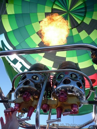 Das Bild zeigt den Blick vom Korb eines Heißluftballons auf die Brenner und in das Innere des Ballons. Es gelten die Nutzungsbedingungen der Mediothek und Pixiothek.
