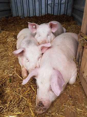 Das Foto gehört zur Serie "Bauernhof". Es zeigt Schweine im Schweinestall. Es gelten die Nutzungsbedingungen der Mediothek und Pixiothek.