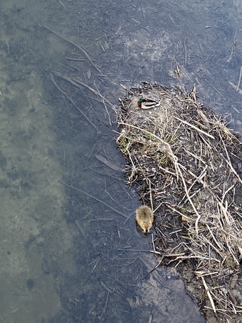 Das Bild zeigt ein Motiv aus dem Park an der Ilm in Weimar vom April 2020. Im Wasser zu sehen ist eine Bisamratte. Es gelten die Nutzungsbedingungen der Mediothek und Pixiothek.
