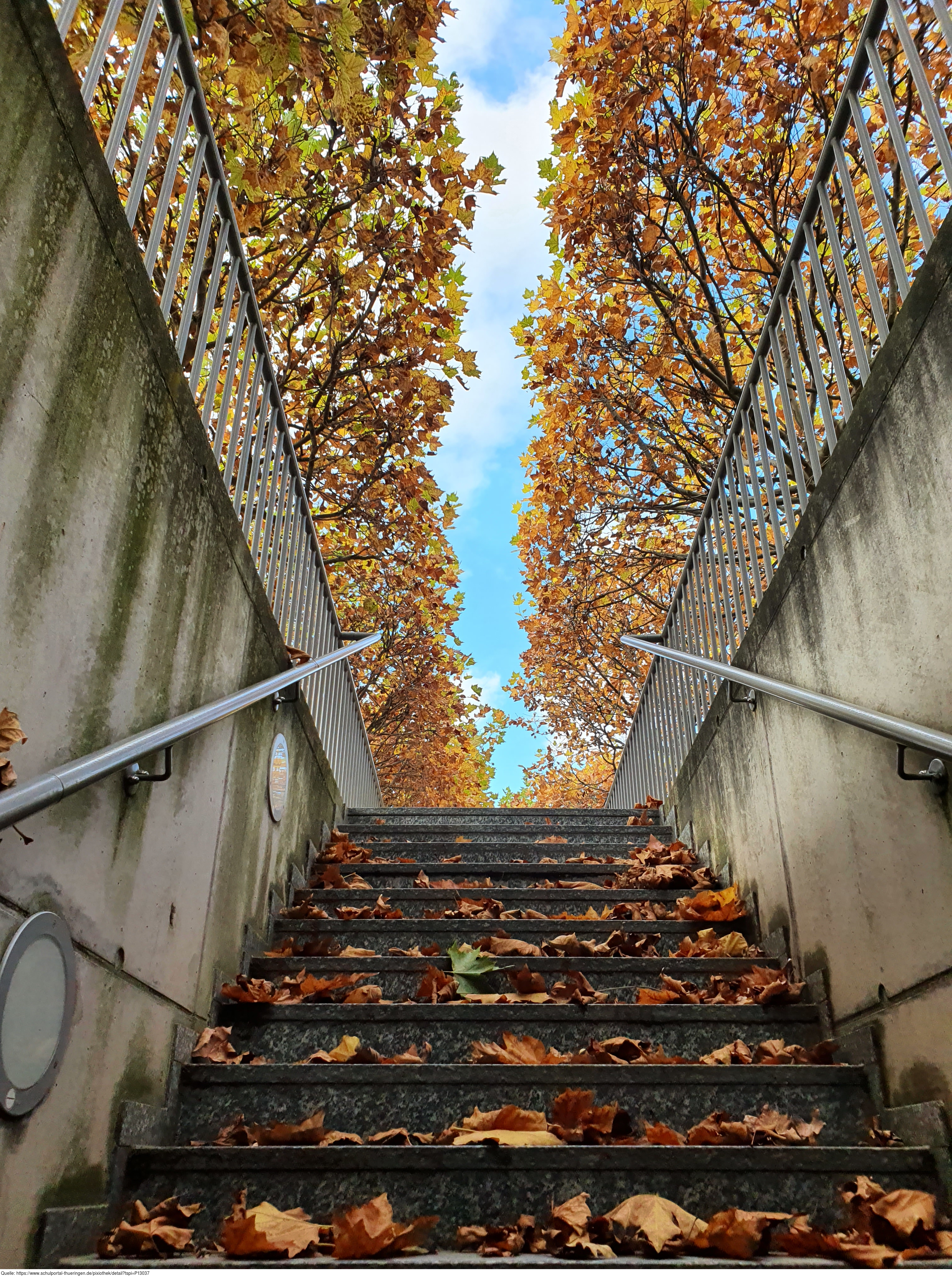 Durch bunte Blätter die Treppe hinauf in einen Tag im Herbst. Es gelten die Nutzungsbedingungen der Mediothek und Pixiothek.