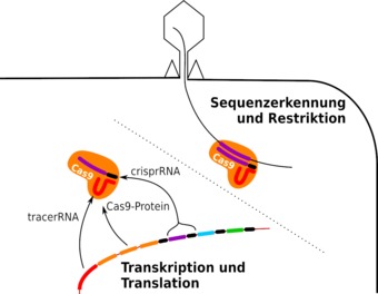 Expression von CRISPR/Cas zur Abwehr einer erneuten Phagen-Infektion. Es gelten die Nutzungsbedingungen der Mediothek und Pixiothek. Auf http://unterricht.petzinger.net/biochdropbox.html auch als svg und in CC-BY verfügbar.