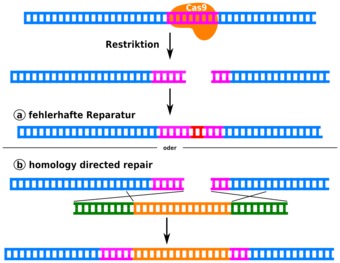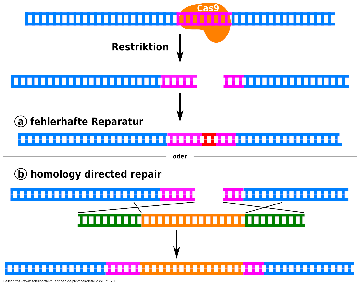 Einsatz des CRISPR/Cas-Systems zur Modifikation von DNA: (1) Erstellung einer KO-Mutante (2) Integration eines Genes durch homologe Rekombination. Es gelten die Nutzungsbedingungen der Mediothek und Pixiothek. Auf http://unterricht.petzinger.net/biochdropbox.html auch als svg und in CC-BY verfügbar.