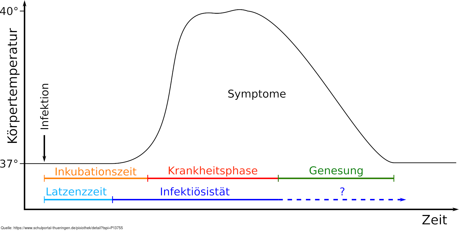 Ablauf einer Infektionskrankheit mit Bezeichnung der einzelnen Phasen (nach Symptomatik bzw. Infektiösität). Es gelten die Nutzungsbedingungen der Mediothek und Pixiothek. Auf http://unterricht.petzinger.net/biochdropbox.html auch als svg und in CC-BY verfügbar.