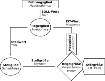 Regelkreis der Schilddrüse. Es gelten die Nutzungsbedingungen der Mediothek und Pixiothek. Auf http://unterricht.petzinger.net/biochdropbox.html auch als svg und in CC-BY verfügbar.