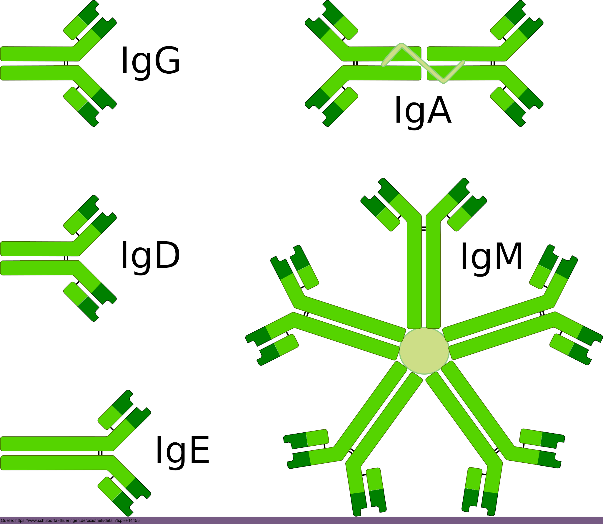 Übersicht über die humanen Immunglobulin-Klassen. Es gelten die Nutzungsbedingungen der Mediothek und Pixiothek. Auf http://unterricht.petzinger.net/biochdropbox.html auch als svg und in CC-BY verfügbar.