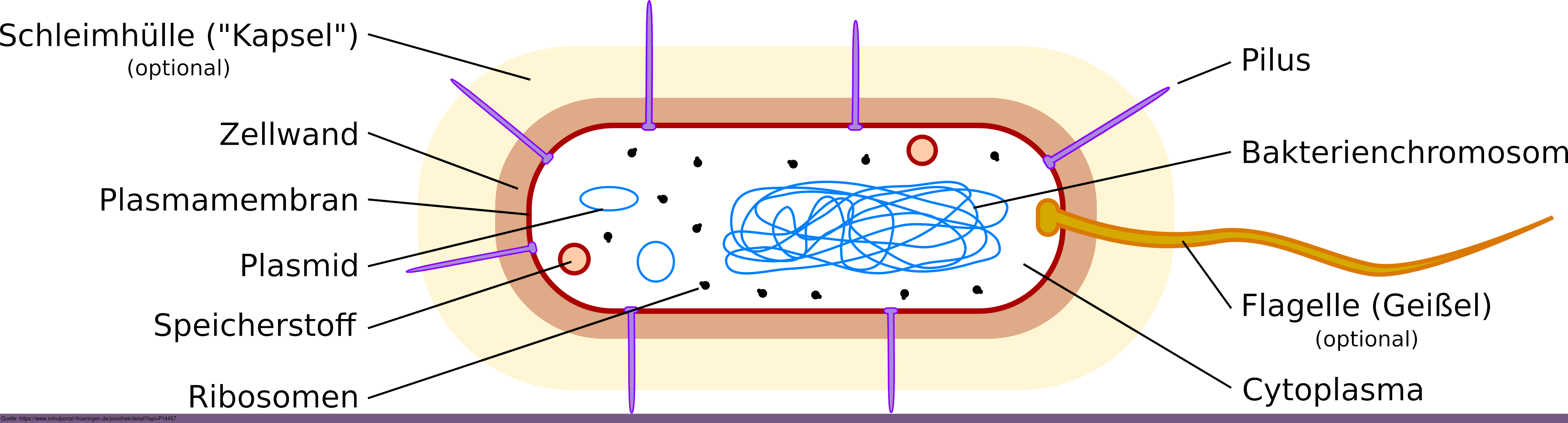 Aufbau / Struktur eines Bakteriums. Es gelten die Nutzungsbedingungen der Mediothek und Pixiothek. Auf http://unterricht.petzinger.net/biochdropbox.html auch als svg und in CC-BY verfügbar.