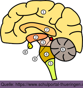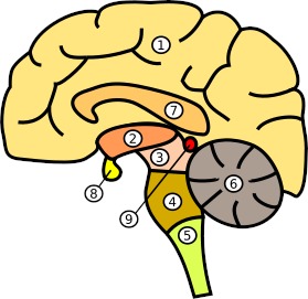 (1) Großhirn, (2) Zwischenhirn, (3) Mittelhirn, (4) Hinterhirn, (5) Nachhirn, (6) Kleinhirn, (7) Balken, (8) Hypophye und Hypothalamus, (9) Epiphyse.