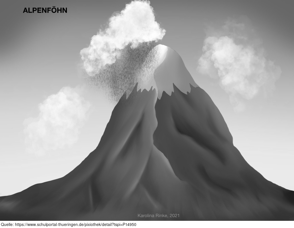 Das Bild gehört zur Serie "Grafische Darstellung Alpenföhn". Das Bild verdeutlicht den Alpenföhn (Föhnwind des Alpenraumes). Bild-Variante: Berg mit Wolken und Niederschlag; s/w; unbeschriftet. Es gelten die Nutzungsbedingungen der Mediothek und Pixiothek.