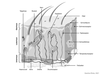 Das Bild gehört zur Serie "Organe des Menschen". Das Bild verdeutlicht den Aufbau der menschlichen Haut. Bild-Variante: s/w; beschriftet. Es gelten die Nutzungsbedingungen der Mediothek und Pixiothek.