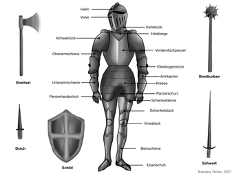 Das Bild zeigt einen Ritter in Rüstung und mit Ausrüstung. Bild-Variante: s/w; beschriftet. Es gelten die Nutzungsbedingungen der Mediothek und Pixiothek.