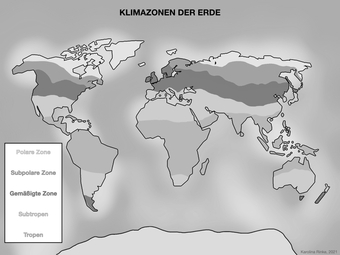Das Bild verdeutlicht die Lage der Klimazonen der Erde. Bild-Variante: s/w; beschriftet. Es gelten die Nutzungsbedingungen der Mediothek und Pixiothek.