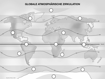 Das Bild gehört zur Serie „Zirkulationssysteme der Erde“. Es verdeutlicht die globale atmosphärische Zirkulation der Erde. Bild-Variante: s/w; leere Vorlage. Es gelten die Nutzungsbedingungen der Mediothek und Pixiothek.