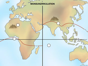 Das Bild gehört zur Serie „Zirkulationssysteme der Erde“. Es verdeutlicht die Monsunzirkulation der Erde. Bild-Variante: farbig; leere Vorlage. Es gelten die Nutzungsbedingungen der Mediothek und Pixiothek.