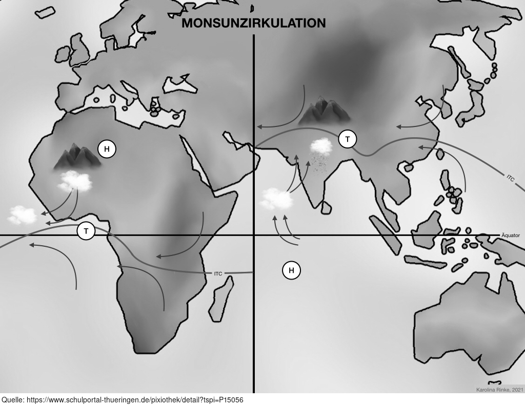Das Bild gehört zur Serie „Zirkulationssysteme der Erde“. Es verdeutlicht die Monsunzirkulation der Erde. Bild-Variante: s/w; unbeschriftet; mit Pfeilen für Winde. Es gelten die Nutzungsbedingungen der Mediothek und Pixiothek.