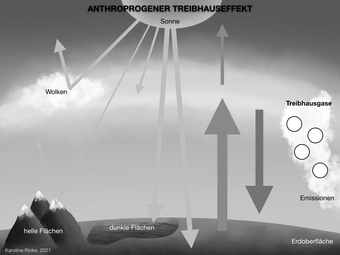 Das Bild verdeutlicht den anthropogenen Treibhauseffekt. Bild-Variante: s/w; teilbeschriftet. Es gelten die Nutzungsbedingungen der Mediothek und Pixiothek.