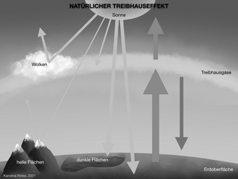 Das Bild verdeutlicht den natürlichen Treibhauseffekt. Bild-Variante: s/w; teilbeschriftet. Es gelten die Nutzungsbedingungen der Mediothek und Pixiothek.