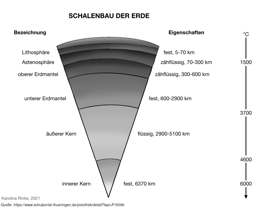 Das Bild verdeutlicht den Schalenaufbau der Erde. Bild-Variante: s/w; beschriftet. Es gelten die Nutzungsbedingungen der Mediothek und Pixiothek.