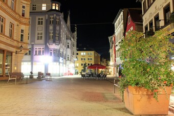 Motiv eines Stadtrundganges durch Pößneck (Ostthüringen) bei Nacht. Abgebildet ist ein Blick in die Fußgängerzone. Im großen hellen Gebäude links befinden sich die Geschäftsräume der Kreissparkasse Saale-Orla. Es gelten die Nutzungsbedingungen der Mediothek und Pixiothek.