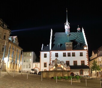 Motiv eines Stadtrundganges durch Pößneck (Ostthüringen) bei Nacht. Abgebildet ist ein Blick über den schiefen Markt zum Marktbrunnen und zum Rathaus. Es gelten die Nutzungsbedingungen der Mediothek und Pixiothek.