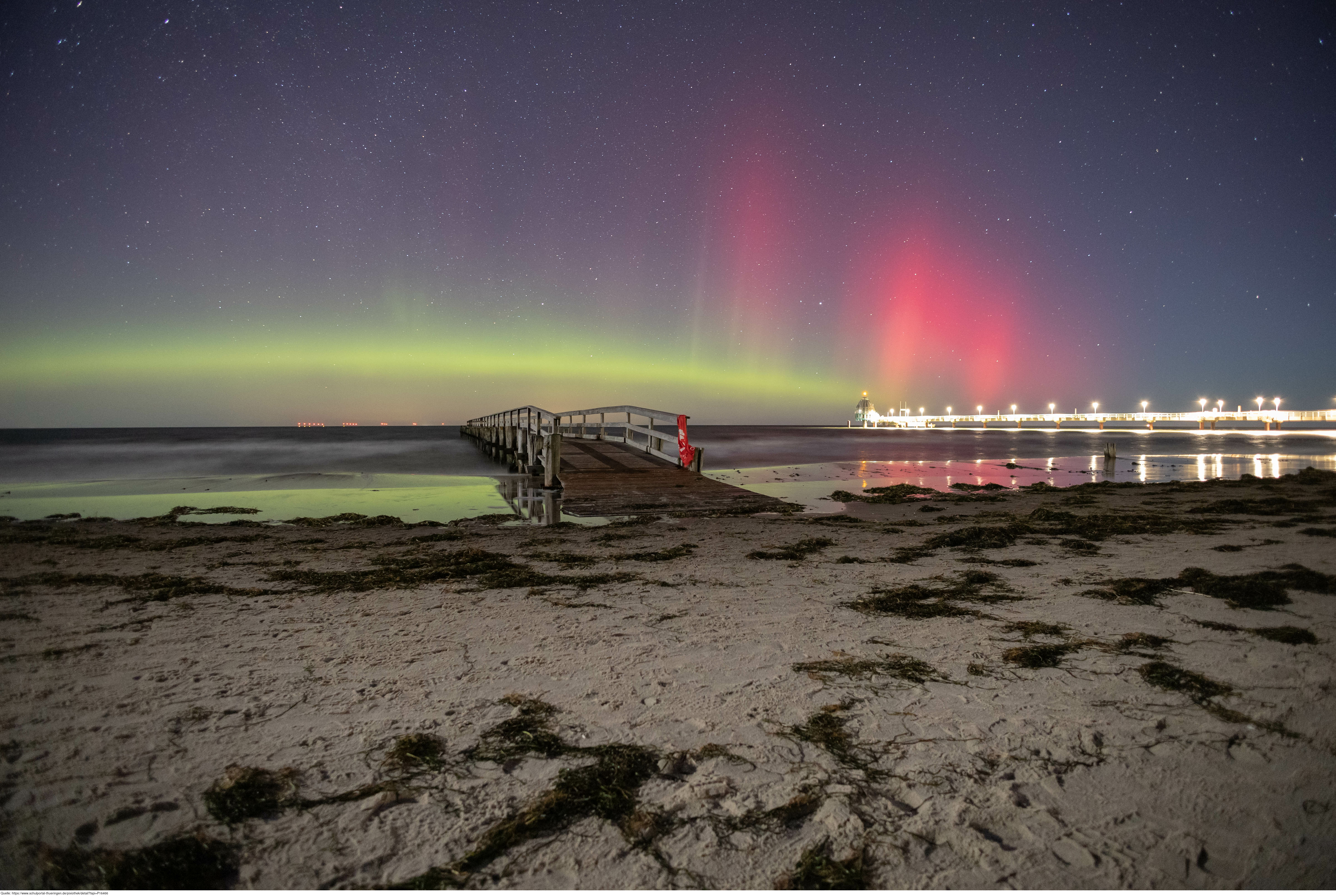 Das Bild gehört zur Serie „Polarlichter 2023 Zingst“. Es zeigt Polarlichter, die in der Nacht vom 26. Auf den 27. Februar 2023 gegen 0:30 in Zingst auf dem Darß mit einer Canon EOS RP aufgenommen wurden. Die Kameraeinstellungen: ISO 1600; Blende 2,8; 15 Sekunden Belichtung; manueller Modus. Mit bloßem Auge waren die Polarlichter in dieser Nacht deutlich zu sehen, aber natürlich nicht so farbenfroh wie auf dem Foto. Es gelten die Nutzungsbedingungen der Mediothek und Pixiothek.