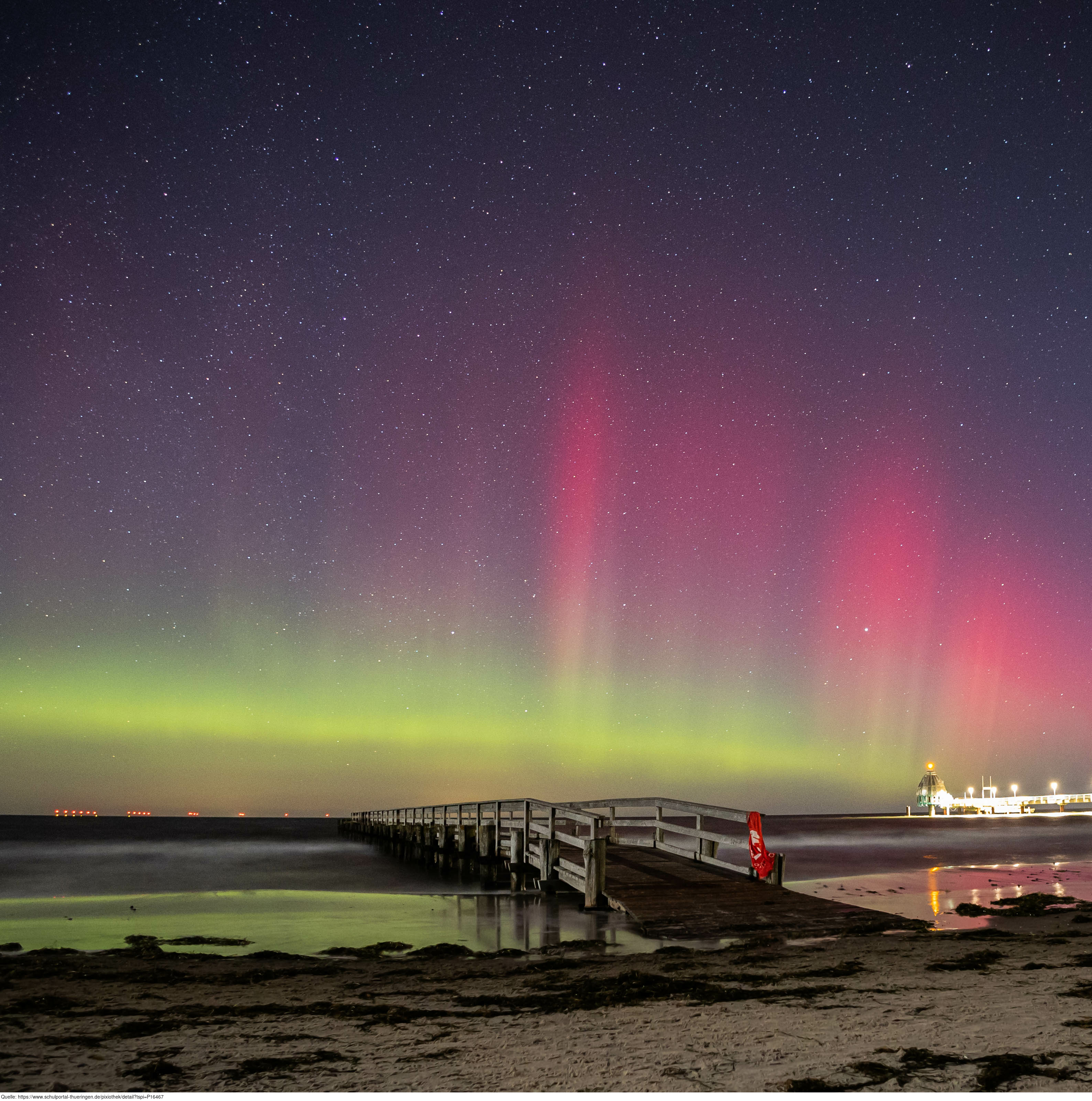 Das Bild gehört zur Serie „Polarlichter 2023 Zingst“. Es zeigt Polarlichter, die in der Nacht vom 26. Auf den 27. Februar 2023 gegen 0:30 in Zingst auf dem Darß mit einer Canon EOS RP aufgenommen wurden. Die Kameraeinstellungen: ISO 1600; Blende 2,8; 15 Sekunden Belichtung; manueller Modus. Mit bloßem Auge waren die Polarlichter in dieser Nacht deutlich zu sehen, aber natürlich nicht so farbenfroh wie auf dem Foto. Es gelten die Nutzungsbedingungen der Mediothek und Pixiothek.
