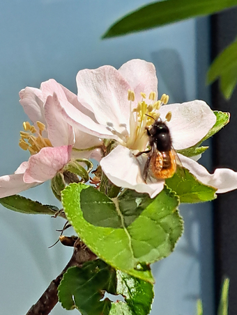 Gehörnte Mauerbiene auf einer Apfelblüte
