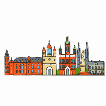 Das Bild zeigt eine gezeichnete Skyline von Wiesbaden. Das Bild ist unter CC0 lizenziert und kann somit frei verwendet werden.