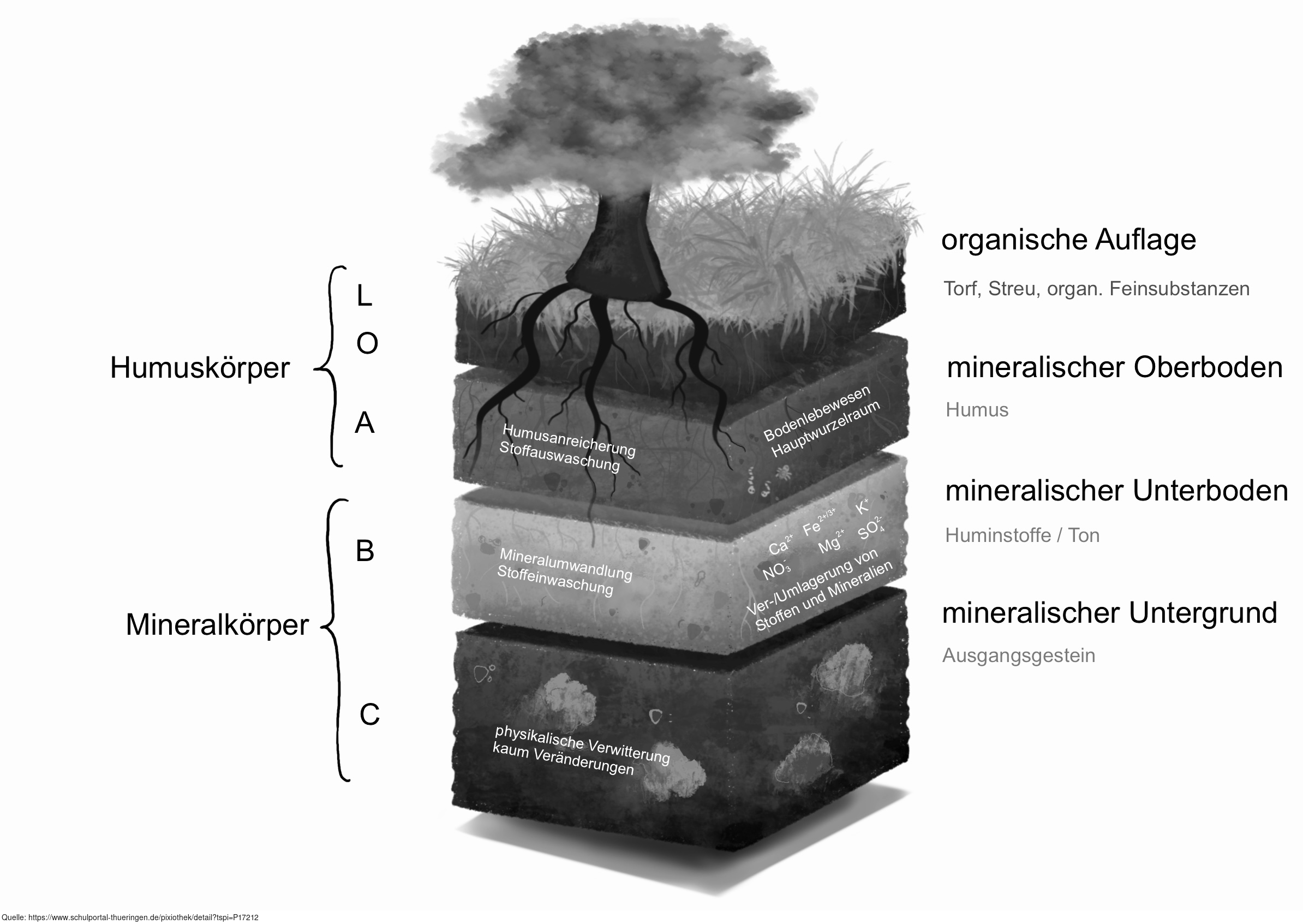 Das Bild verdeutlicht den typischen Aufbau des Bodens und die Zusammensetzung der jeweiligen Bodenhorizonte. Variante: s/w; beschriftet. Es gelten die Nutzungsbedingungen der Mediothek und Pixiothek.