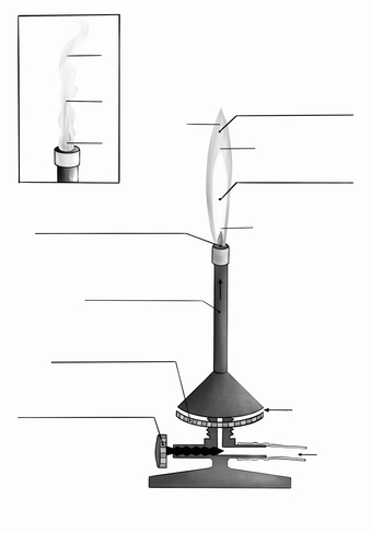 Das Bild verdeutlicht den Aufbau eines Bunsenbrenners. Variante: zwei Flammen, s/w; unbeschriftet. Es gelten die Nutzungsbedingungen der Mediothek und Pixiothek.
