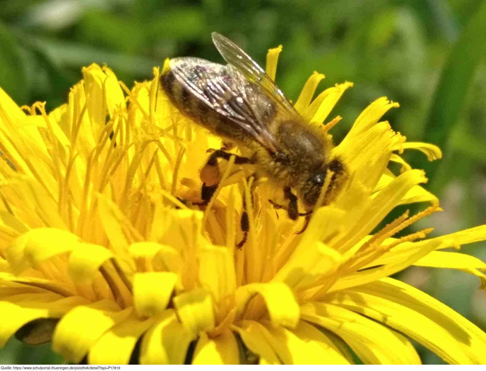 Das Bild gehört zur Serie "Saalfelder Honig", aufgenommen vom Imker Bernd Rümpler, Inhaber von saalfelder-honig.de. Zu sehen ist eine Honigbiene - Flugbiene- beim Sammeln auf einer Löwenzahnblüte. Die Biene klebt Pollen an ihre Hinterbeine, indem sie diesen mit körpereigenen Stoffen vermischt - Pollenhöschen. In ihrem Fell haften sich Pollenkörnchen an, durch welche dann auf der nächsten Blüte deren Befruchtung erfolgt. Mit dem Rüssel nimmt sie am Blütengrund Nektar auf und transportiert diesen im Honigmagen zum Bienenstock. Es gelten die Nutzungsbedingungen der Mediothek und Pixiothek.