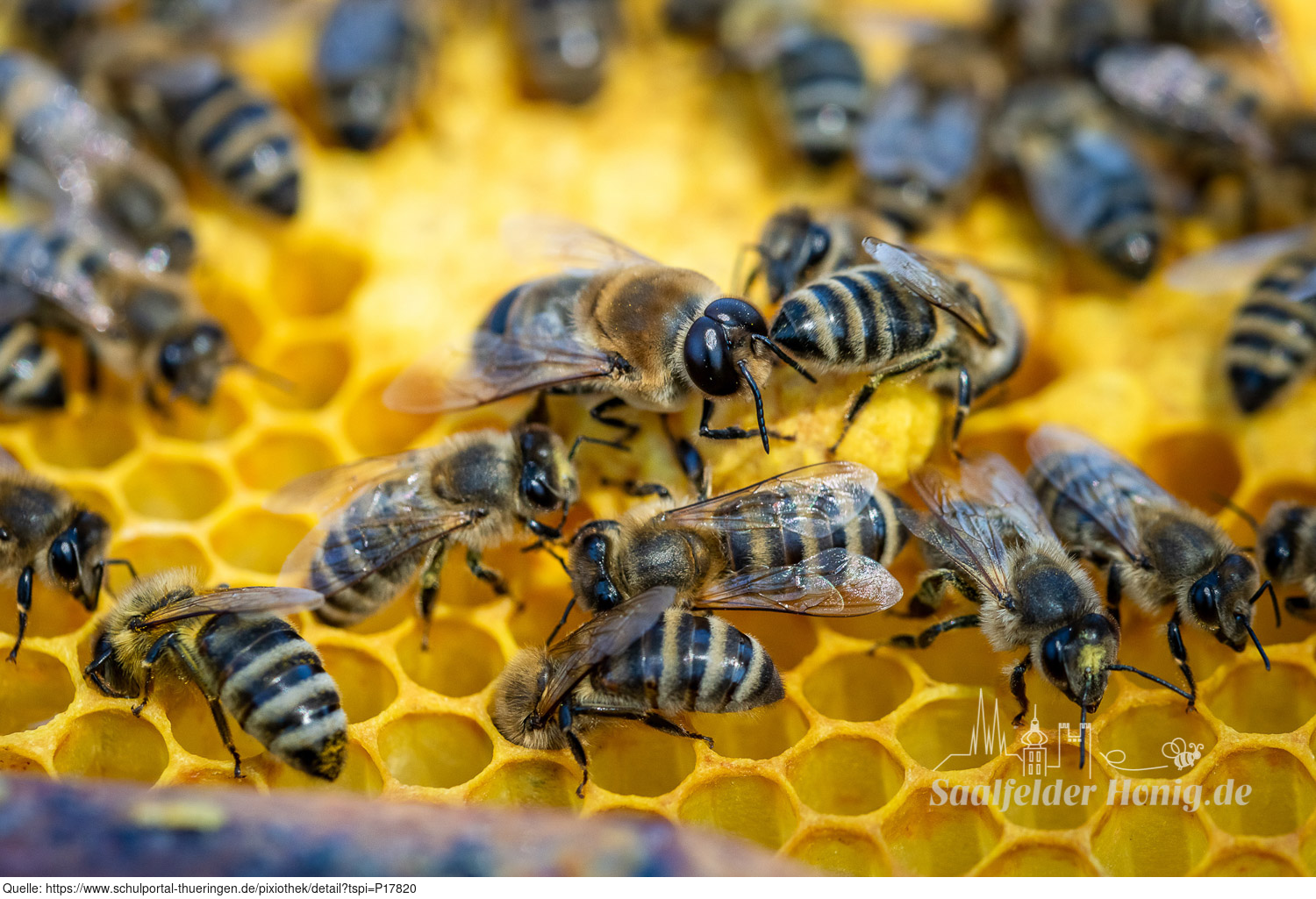 Das Bild gehört zur Serie "Saalfelder Honig", aufgenommen vom Imker Bernd Rümpler, Inhaber von saalfelder-honig.de. Zu sehen sind Arbeiterbienen -Stockbienen - bei der Brutpflege. Zentral im Bild befindet sich eine Weiselzelle oder Nachschaffenszelle einer Königin. Es gelten die Nutzungsbedingungen der Mediothek und Pixiothek.