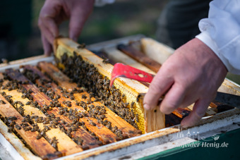 Das Bild gehört zur Serie "Saalfelder Honig", aufgenommen vom Imker Bernd Rümpler, Inhaber von saalfelder-honig.de. Zu sehen ist ein Imker mit Stockmeisel am geöffnetem Bienenvolk beim Ziehen einer Wabe.