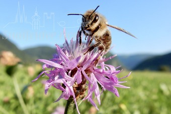 Das Bild gehört zur Serie "Saalfelder Honig", aufgenommen vom Imker Bernd Rümpler, Inhaber von saalfelder-honig.de. Zu sehen ist eine Flugbiene auf einer Kornblume. Es gelten die Nutzungsbedingungen der Mediothek und Pixiothek.