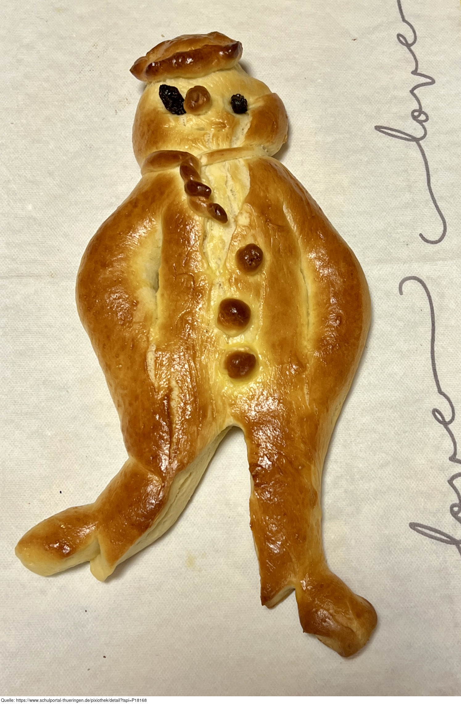 Das Foto zeigt einen fertig gebackenen Weckmann. Als Weckmann wird ein Gebäck in Form eines stilisierten Mannes aus Hefeteig bezeichnet, welches oftmals mit Rosinen verziert ist. Es gelten die Nutzungsbedingungen der Mediothek und Pixiothek